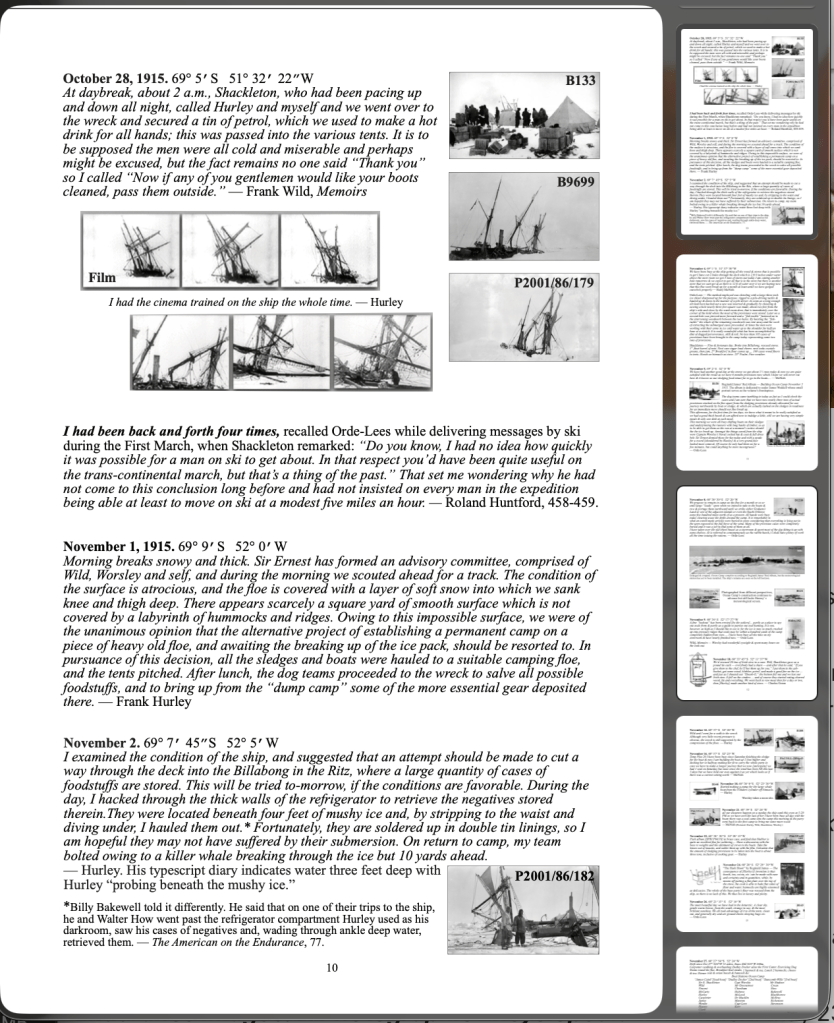 The Files Below were generated during my Endurance expedition studies between the late 1970’s and early 2000’s when, involved with several publishers and manuscripts, I put “the pile” of what I’d gathered into distinct folders for easier reference. My Endurance work entered quasi-retirement in 2008 when I began lecturing and driving Zodiacs on polar expedition ships. It was reorganized during the Covid 19 epidemic and now offered for use.