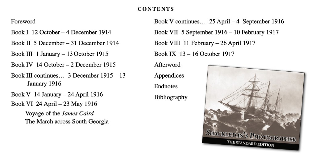 Supplemental. Shackleton’s Photographer: Photographs of Scenes and Diary of Incidents in Connection with Happenings to the Weddell Sea Party 12th October, 1914 — 16th October, 1917. ISBN 0-9703148-2-5 on CD-ROM. Foreword; Afterword; 8 appendices; exhaustive endnotes; extensive bibliography; heavily illustrated. Fully Printable. 343 landscape pages. 110 MB in 14 chapters. Requires postage of a dollar or two.